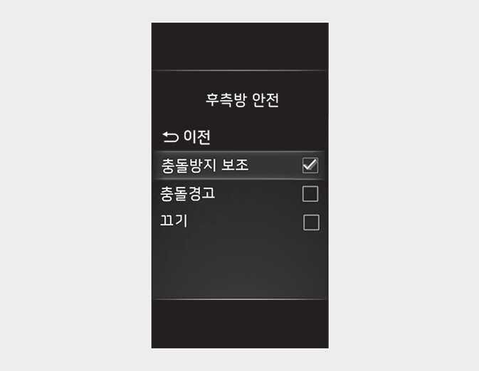 후측방 안전 시스템은 ‘후측방 안전’ 메뉴를 선택하여 ‘충돌방지 보조 / 충돌 경고 / 끄기’ 중 하나를 선택할 수 있습니다.