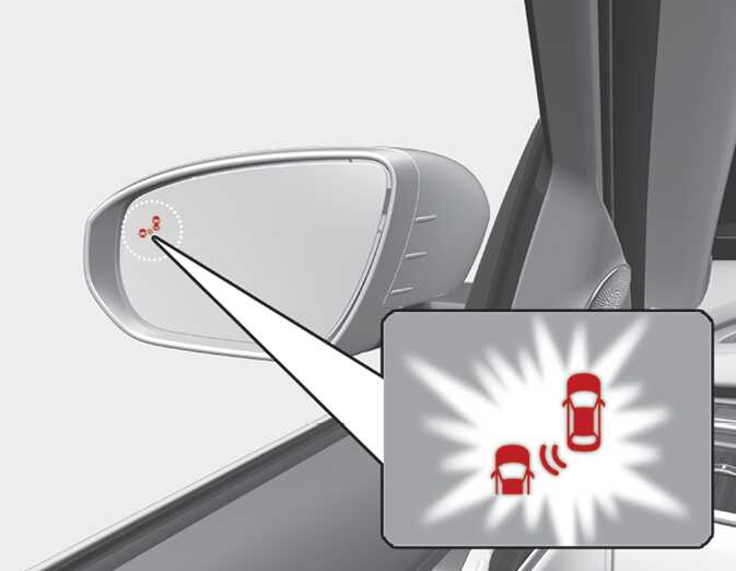 일정 거리 내 자차 후측방에 차량을 감지할 경우 실외 미러와 헤드업 디스플레이(사양 적용 시)에 경고등이 켜집니다.