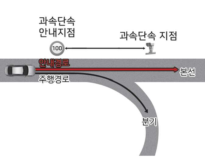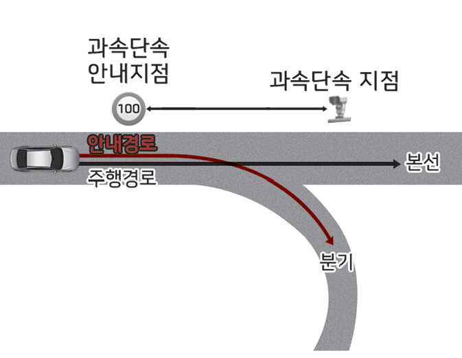 설정한 경로(본선 유지)의 과속단속 카메라 정보에 의해 고속도로 안전구간 자동감속은 작동합니다. 하지만, 전용도로 분기선으로 진입하여 경로 이탈이라고 판단 할 경우 고속도로 안전구간 자동감속은 작동 하지 않습니다. 이때, 원하지 않는 감속 제어가 일시적으로 발생 할 수 있습니다.