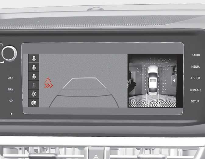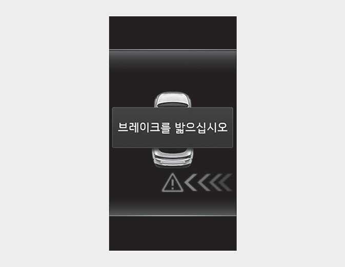 후방 교차 충돌 경고 발생 중 충돌 위험이 판단되면 제동 제어를 합니다. 제어가 발생하면 계기판에 경고를 통해 운전자에게 알려줍니다. 후방 모니터가 작동 중이면 인포테인먼트 시스템 화면(사양 적용 시)에도 경고를 표시합니다.