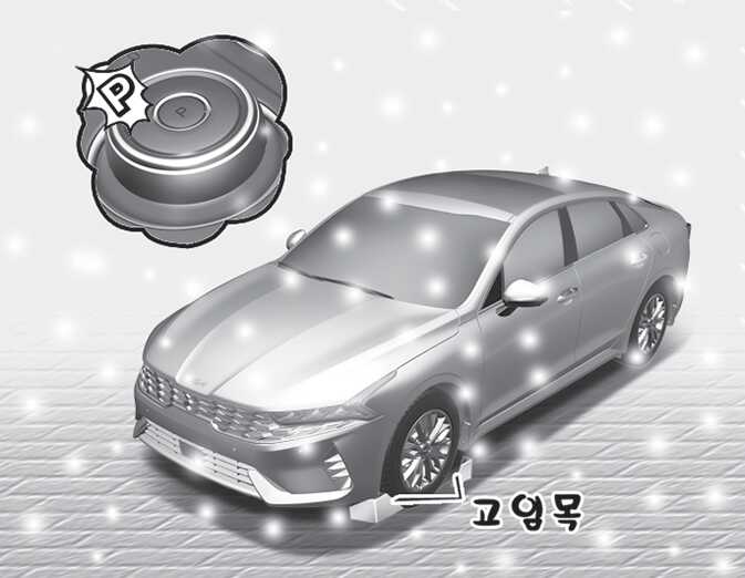 매우 추운 날씨의 주·정차 시 주차 브레이크를 작동시켜 놓으면 브레이크 장치가 얼어 붙어버릴 우려가 있으므로 주차 브레이크는 가능한 풀어 놓은 상태에서 주차하십시오. 경사없는 평지에 변속 위치를 「P」(주차) 위치로, 타이어에는 고임목을 받쳐 차가 움직이지 않도록 하십시오.