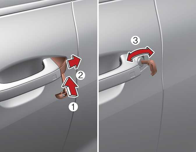 도어를 열기 위해서는 차 밖에서 커버 (2) 탈거 후 보조키(1)로 도어 잠금 해제 후 여십시오.