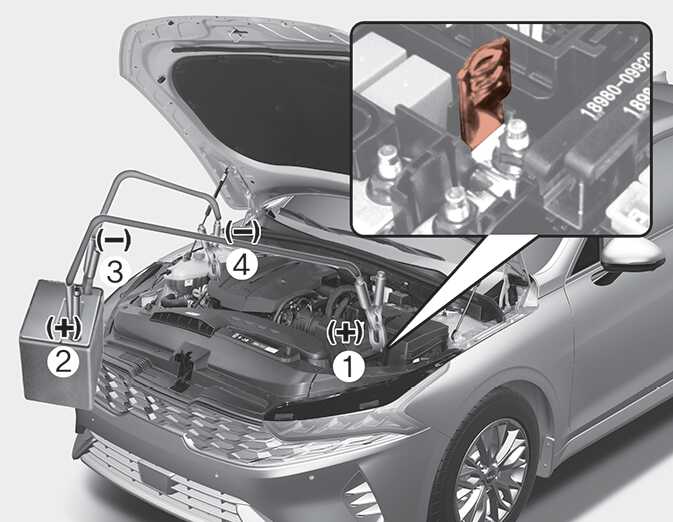 보조 배터리의 음극(-)(3)과 방전된 차량의 래치(4)에 점프 케이블을 연결 하십시오.