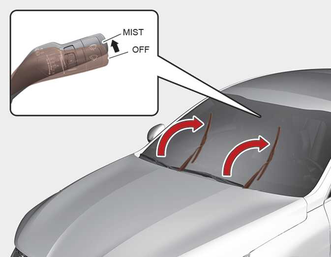 엔진 시동을 끈 후 20초 이내에 와이퍼가 최상단으로 올라 갈 때까지 와이퍼 스위치를 2초 이상 「MIST」위치로 올리십시오.
