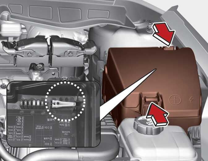 시동 ‘OFF' 상태에서 모든 전기 장치 스위치를 끈 후, 엔진룸 퓨즈 박스에 설치된 퓨즈 교체용 클립(퓨즈 뽑개)으로 단선된 퓨즈를 제거하고 같은 용량의 예비퓨즈를 손으로 단단히 삽입하십시오.