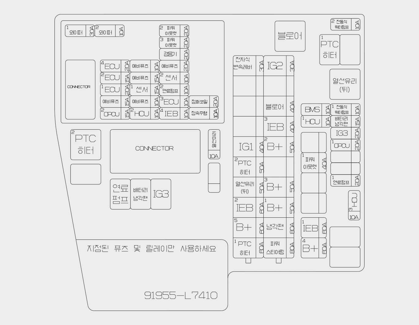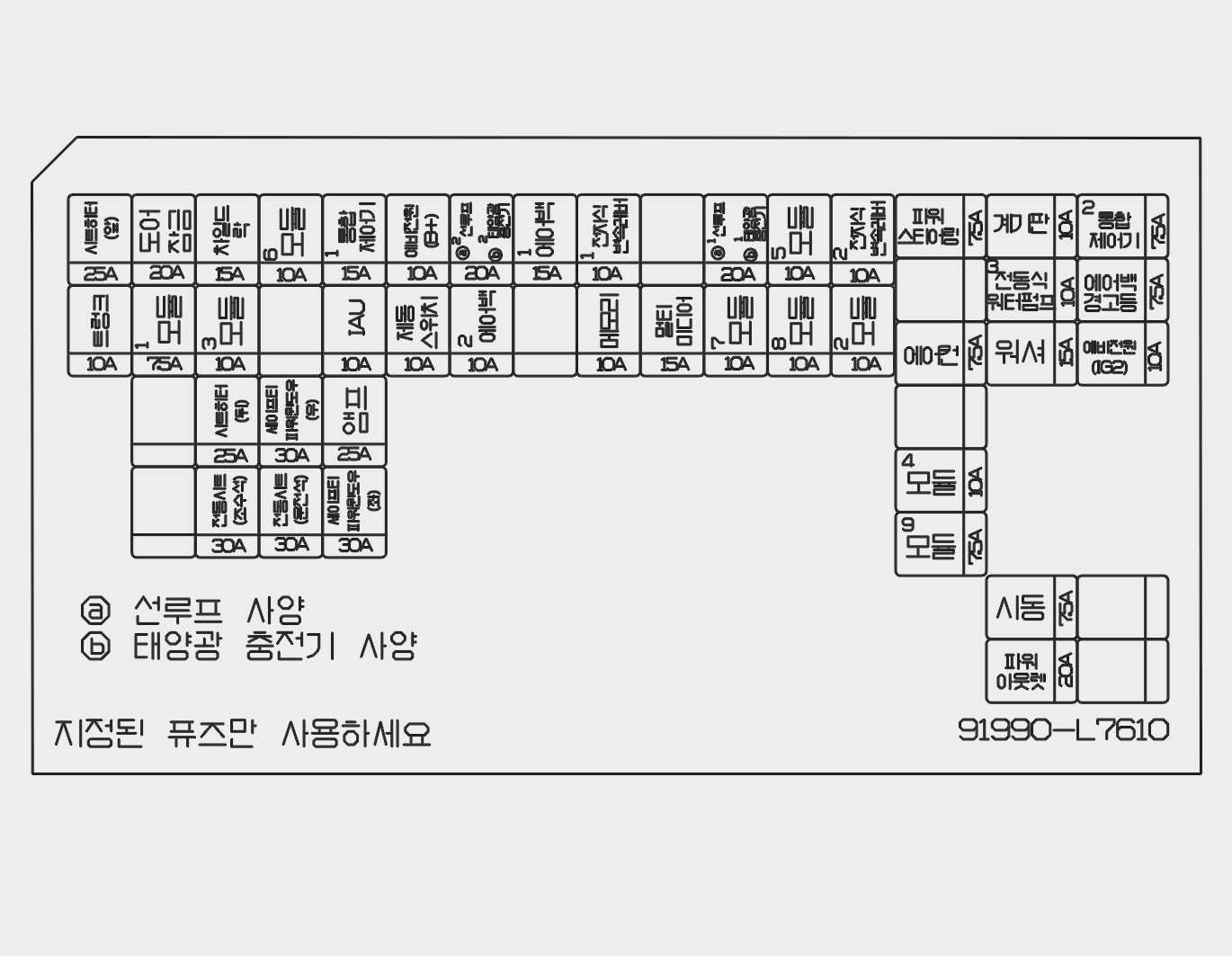 엔진룸 퓨즈 박스 내 이름없는 공란 퓨즈는 예비퓨즈가 아니므로 임의로 빼지 마십시오. 임의로 뺄 경우 해당 시스템이 작동하지 않을 수 있습니다.