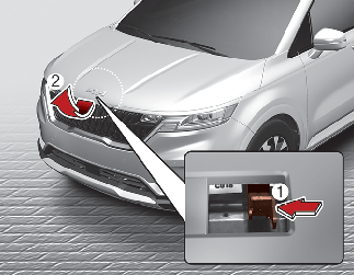 차량의 앞에서 엔진 후드를 약간 들어 올리고, 중앙에 위치한 2차 열림 레버(1)를 왼쪽으로 밀고 있는 상태에서 후드(2)를 위로 들어 올리십시오.