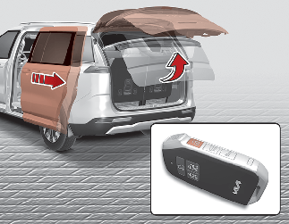 스마트키의 도어 잠금 해제 버튼을 약 3초 이상 누르면 설정된 도어(좌·우 슬라이딩 도어/좌·우 슬라이딩 도어 및 테일게이트)가 열립니다.