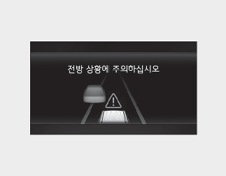 전방 상황 주의 알림이 발생하면 새롭게 나타난 전방의 차량이나 물체와 충돌할 수 있으므로 전방 도로 상황 및 주행 상태를 확인하고 필요하면 브레이크 페달을 밟아 직접 속도를 조절하십시오.