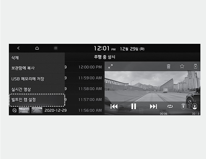 인포테인먼트 시스템 홈 화면에서 빌트인 캠을 선택한 후, 빌트인 캠 설정 → 녹화 → 주행 중 녹화 또는 주차 중 녹화를 차례로 선택하십시오. 주행 및 주차 시 녹화 방법을 선택할 수 있습니다.