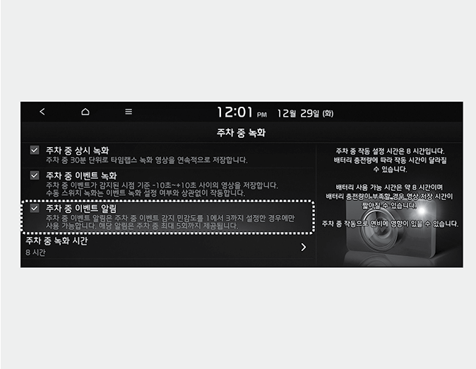 서비스를 사용하려면 인포테인먼트 시스템 홈 화면에서 빌트인 캠을 선택한 후, 빌트 인 캠 설정 → 녹화 → 주차 중 녹화 → 주차 중 이벤트 알림을 선택하십시오.