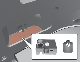 사용 후 타이어 임시수리장치를 실런트(봉합제) 용기와 컴프레서가 조립된 상태로 차내 제자리에 두십시오.