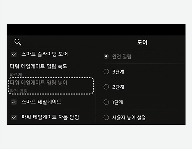 인포테인먼트 시스템의 설정 메뉴에서 '도어→파워 테일게이트 열림 높이→완전열림/3단계/2단계/1단계/사용자 높이 설정'을 설정하면 테일게이트 열림 높이를 설정할 수 있습니다.