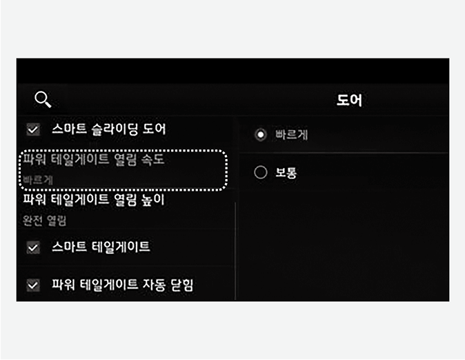 인포테인먼트 시스템의 설정메뉴에서 '도어→파워 테일게이트 열림 속도→빠르게/느리게'를 선택하면 파워 테일게이트가 열리는 속도를 설정할 수 있습니다.
