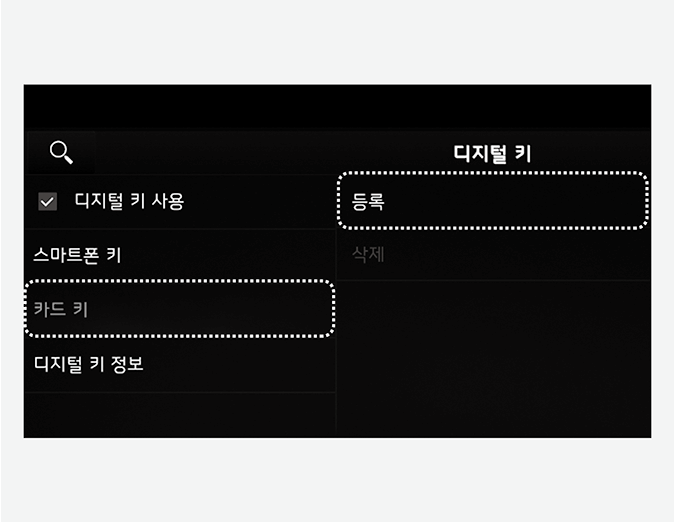 * 인포테인먼트 시스템 사양 적용 시: 인포테인먼트 전체 메뉴 화면에서 '설정→차량→디지털 키→카드 키' 하위 메뉴로 이동하여 '등록'을 누르십시오.