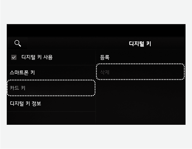등록되어 있는 디지털 키(카드)가 없다면 '삭제'가 비활성화되어 있습니다.