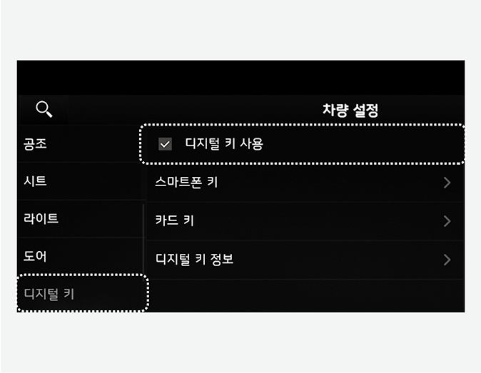 * 인포테인먼트 시스템 사양 적용 시: 인포테인먼트 전체 메뉴 화면에서 '설정→차량→디지털 키→디지털 키 사용' 체크 해제