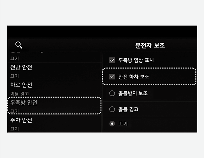 시동 「ON」 상태에서 설정 메뉴의 「운전자 보조→후측방 안전→안전 하차 보조」를 선택하면 기능이 켜집니다. 기능을 끄고 싶으면 선택을 해제해야 합니다.