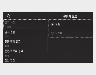 시동 「ON」 상태에서 설정 메뉴의 「운전자 보조→경고 시점」을 선택하면 운전자 보조 기능의 경고 시점을 변경할 수 있습니다.