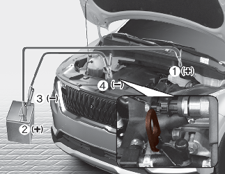보조배터리의 음극(-)(3)과 방전된 차량의 엔진 리프트 브래킷(4)에 점프 케이블을 연결하십시오.