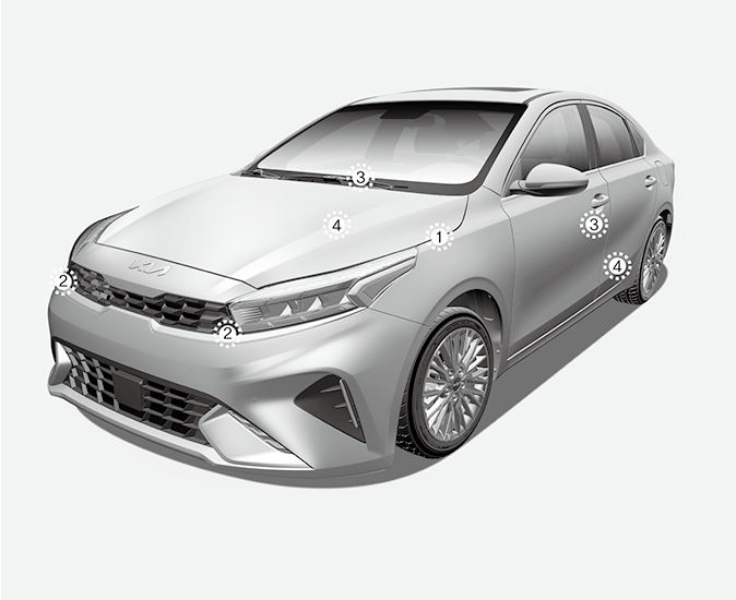 • Problems may arise if the sensor installation angles are changed due to the deformation of the front bumper, body or front door and B pillars where side collision sensors are installed. In this case, have the system serviced by a professional workshop.