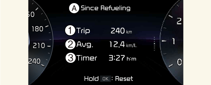 要手動重設資訊,請在檢視從加油後時按住方向盤上的 OK 按鈕。