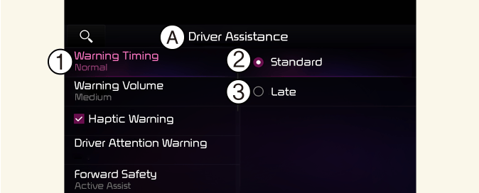 車輛啟動時,從設定功能表選擇駕駛輔助→警告時間,更改前方碰撞預防輔助的啟動時間。