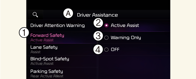 在車輛啟動的情況下,從設定功能表中選擇或取消駕駛輔助→前方安全性以設定是否使用每項功能。