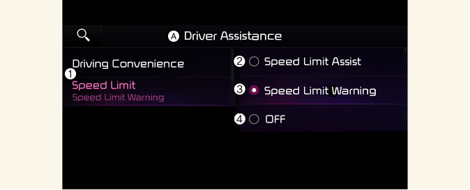 在車輛啟動的情況下,從設定功能表中選擇或停用駕駛者輔助→速限,以設定是否使用每項功能。