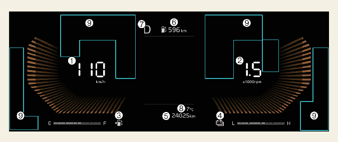 * 예시된 클러스터 형상과 LCD 표시창의 내용은 실제 차량의 형상 및 내용과 상이할 수 있습니다.