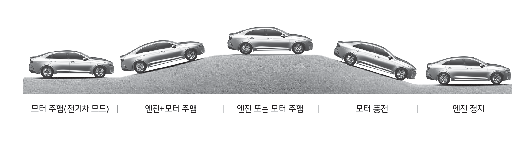 3. 엔진 또는 모터 주행 : 엔진 또는 모터로 구동하며, 배터리 잔량이 적정 수준 이하일 때 충전합니다. |
