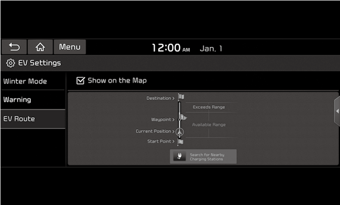 You can apply electric car-related functions for guiding the route. It allows you to check the distance that you can go with the current battery amount. Travelable and non-travelable sections on your way to the destination are displayed on the screen. The search station icon is also displayed so that you can find nearby stations immediately.