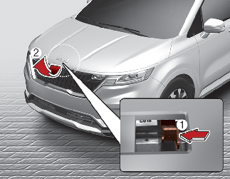 Vaya a la parte delantera del vehículo, eleve el capó ligeramente, después tire del enganche secundario (1) hacia arriba y levante el capó (2).