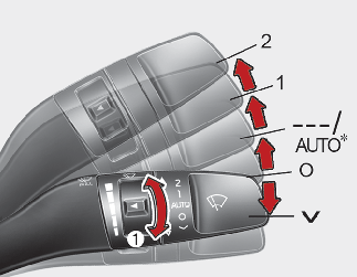Om vindrutetorkarna står på läget AUTO och ENGINE START/STOP (motor start/stopp)-knappen ställs på ON slår vindrutetorkarna ett slag för att utföra en självdiagnos. Ställ in vindrutetorkarna på OFF (O) när de inte används.