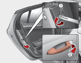 Barnspärren sitter på kanten av varje bakdörr. När barnspärren är låst (1) öppnas inte bakdörrarna när någon drar i det inre dörrhandtaget (2).