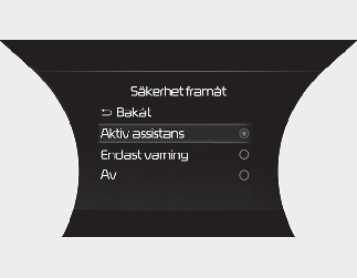 Om ”Aktiv assistent” är valt, kommer det framåtriktade automatiska krocksystemet att varna dig med ett varningsmeddelande och en hörbar varning beroende på kollisionsrisknivåerna