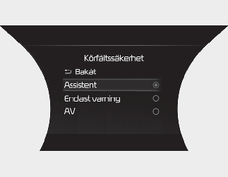 Om “Assist” (Assistent) väljs kommer körfältsassistans att (Lane Keeping Assist) automatiskt vid behov hjälpa föraren att styra bilen för att förhindra att den lämnar körfältet.