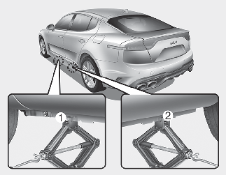 Placera domkraften vid det domkraftsuttag framtill (1) eller baktill (2) som är närmast hjulet som du byter. Sätt domkraften på rätt sätt under ramen. Lyftpunkterna är markerade med två flänsar och en punkt.