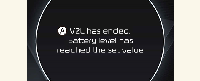Gdy poziom naładowania akumulatora wysokiego napięcia osiągnie ustawioną granicę rozładowania (%), praca zostaje zatrzymana, a na zestawie wskaźników pojawia się komunikat ostrzegawczy. Jeśli użytkownik chce nadal pracować w trybie V2L, musi ustawić limit rozładowania (%) poniżej aktualnego poziomu naładowania akumulatora.