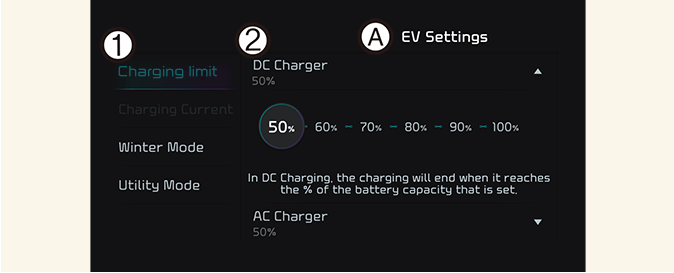 Wybrać ikonę na ekranie. Można ustawić limit ładowania, prąd ładowania, tryb zimowy oraz funkcje trybu użytkowego.