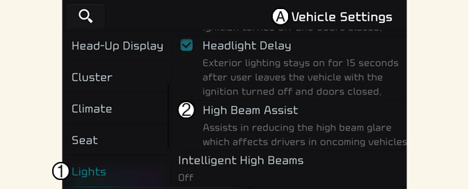 Po włączeniu pojazdu wybrać opcję Ustawienia → Pojazd → Światła → Asystent świateł drogowych (HBA) z menu ustawień, aby włączyć asystenta świateł drogowych.