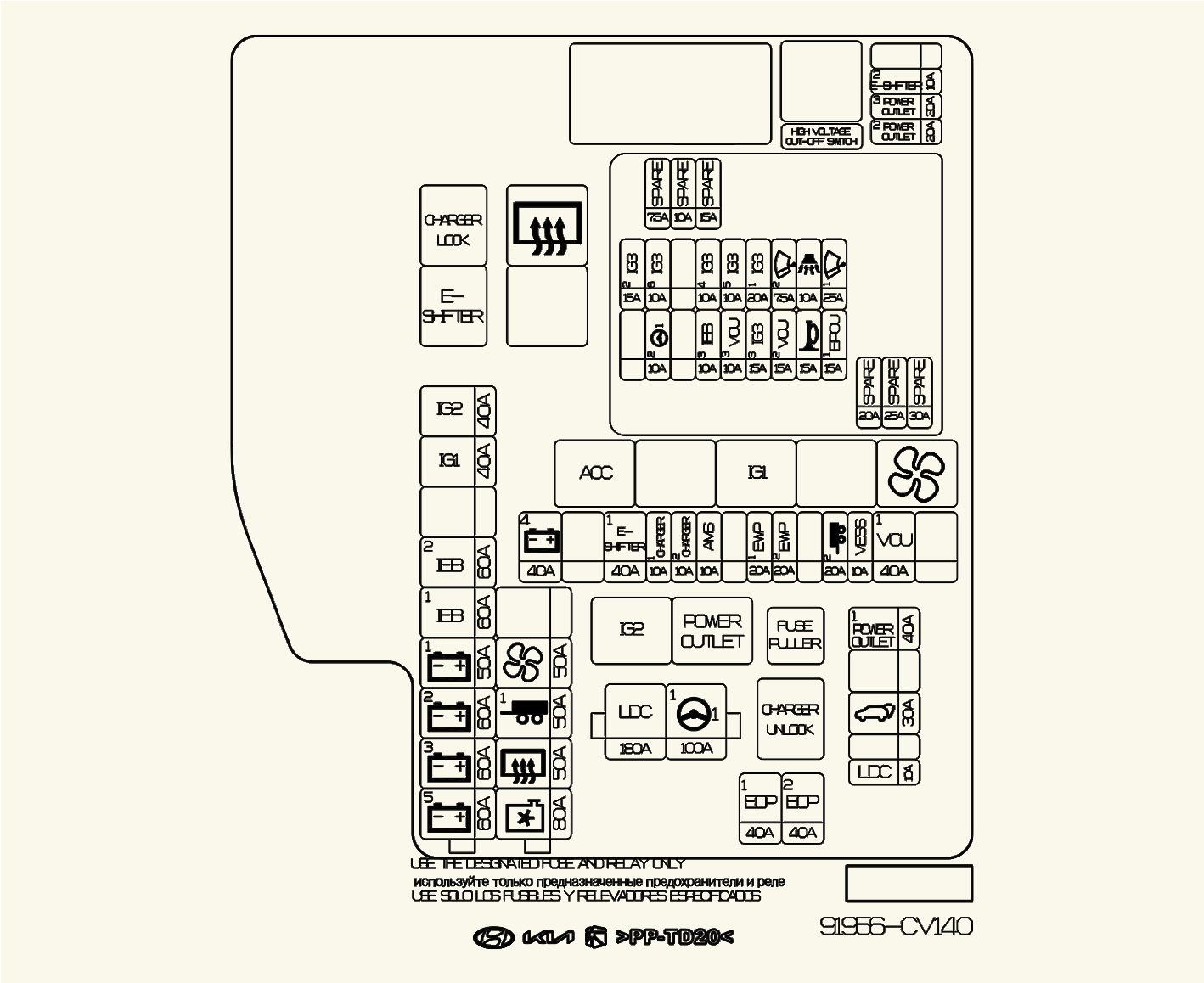 Łączówka ICU (bezpiecznik: CHILD LOCK, AFCU, TAILGATE OPEN, EPCU 3, MODULE8, S/HEATER FRT, SUNROOF1, P/WINDOW LH, AMP, P/WINDOW RH, P/SEAT DRV, P/SEAT PASS, S/HEATER RR) |