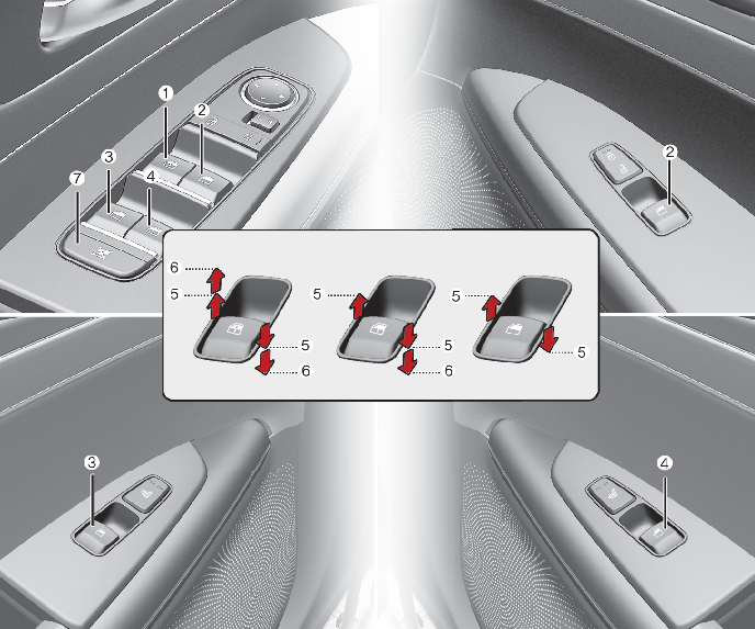 The doors of this vehicle are equipped with power windows that can be operated by a switch.