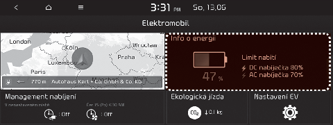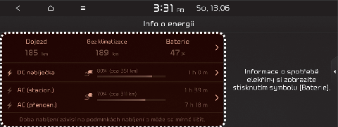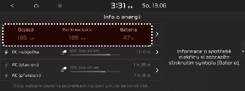 Zjistit lze dojezdovou vzdálenost, zbývající množství energie akumulátoru, odhadovanou dobu nabíjení pro všechny typy nabíječek.