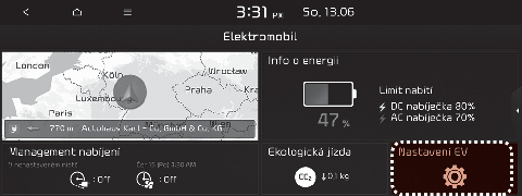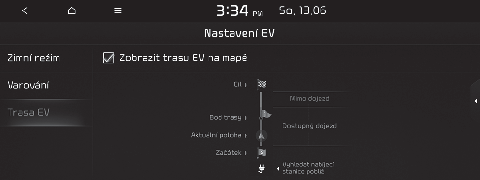 Při hledání trasy navigace můžete zapnout funkci určenou pro elektromobily. Ta umožňuje zjistit vzdálenost, kterou lze ujet při aktuálním nabití akumulátoru. Na obrazovce se zobrazí úseky, které lze ujet, i úseky, které bez dobití akumulátoru neprojedete. Je zde také zobrazena ikona pro hledání dobíjecích stanic, pomocí níž lze hned vyhledat nejbližší dobíjecí stanice.