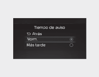 Seleccione "Tarde" como tiempo de aviso si el tráfico es fluido y la velocidad de conducción es baja.