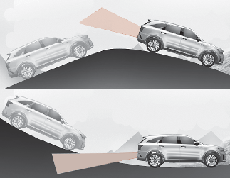 Es posible que la asistencia de prevención de colisión en el punto ciego no funcione correctamente al conducir por una carretera en pendiente. La función podría no detectar el vehículo en el carril contiguo o podría detectar de forma incorrecta el suelo o la estructura.