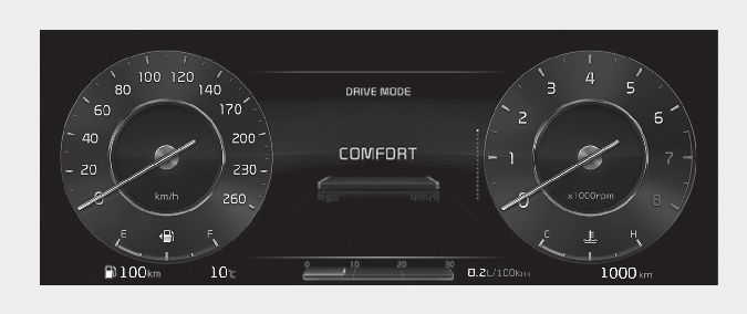 Theme A is the basic theme of the full LCD type cluster and provides different graphic styles depending on drive mode.