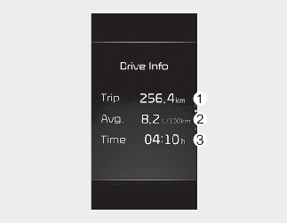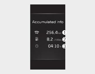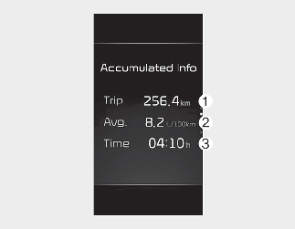 This display shows the trip distance (1), the average fuel efficiency (2), and the total driving time (3) information once per one ignition cycle.