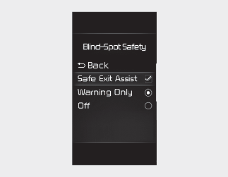 With the ignition switch or ENGINE START/STOP button in the ON position, select 'Driver Assistance → Blind-Spot Safety → Safe Exit Assist' from the Settings menu to turn on Safe Exit Assist and deselect to turn off the function.